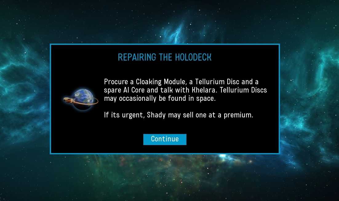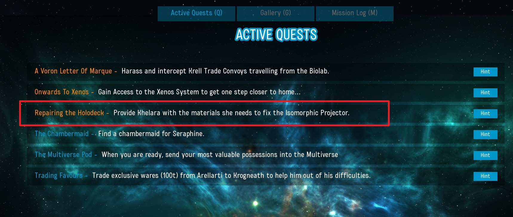 I'm having problem playing this game. A quest of "repairing the holodeck" appeared, and I prepared the materials and talked to Khelara at every hour, but the repairs did not start. Is there another condition required here? My playing version is 220_022-pc.